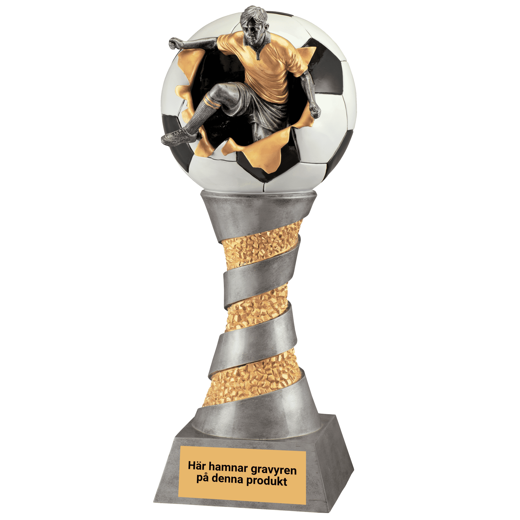 En helt enorm fotbollstrofé! Pelare i matt silver med svart/vit boll och spelare på toppen.