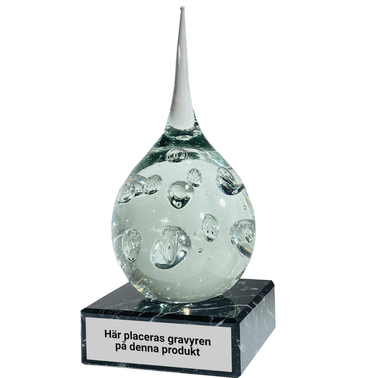 Glasdroppe monterad på en riktig marmorsockel. Gravyren placeras på foten!