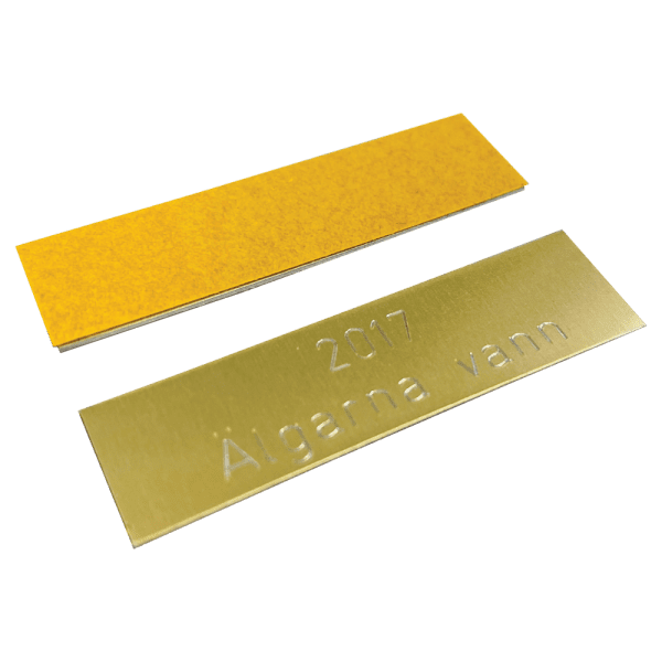 Plåten levereras med dubbelhäftande tejp för enkel montering. Mät noga storleken och ange samma valör som på vandringsprisets befintliga plåtar så att den nya blir likadan.