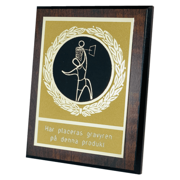 Blank plakett med matt tryck på valnötsfolierad träplakett. Plaketten finns i guld, silver och brons. Vill du att plaketten ska kunna stå själv köp till ett stöd!