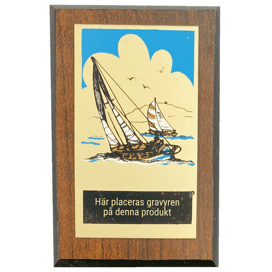 Screentryckt plakett med fyrfärgsmotiv på valnötsfolierad träplakett. Vill du att den ska kunna stå själv köp till ett stöd!